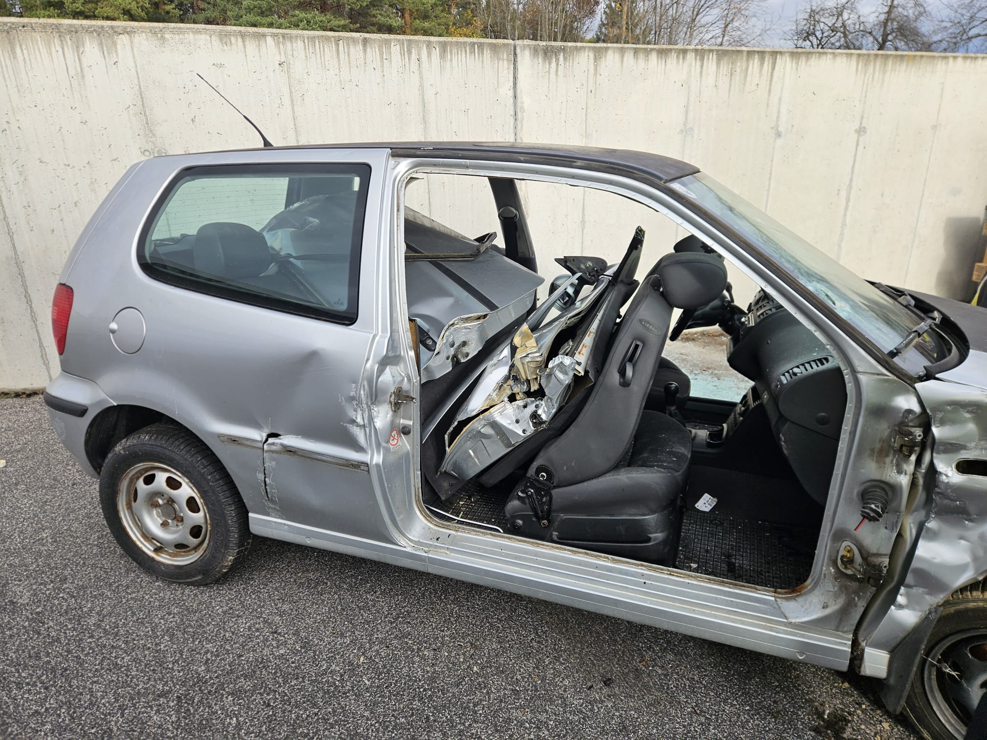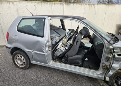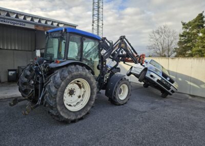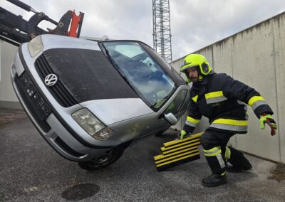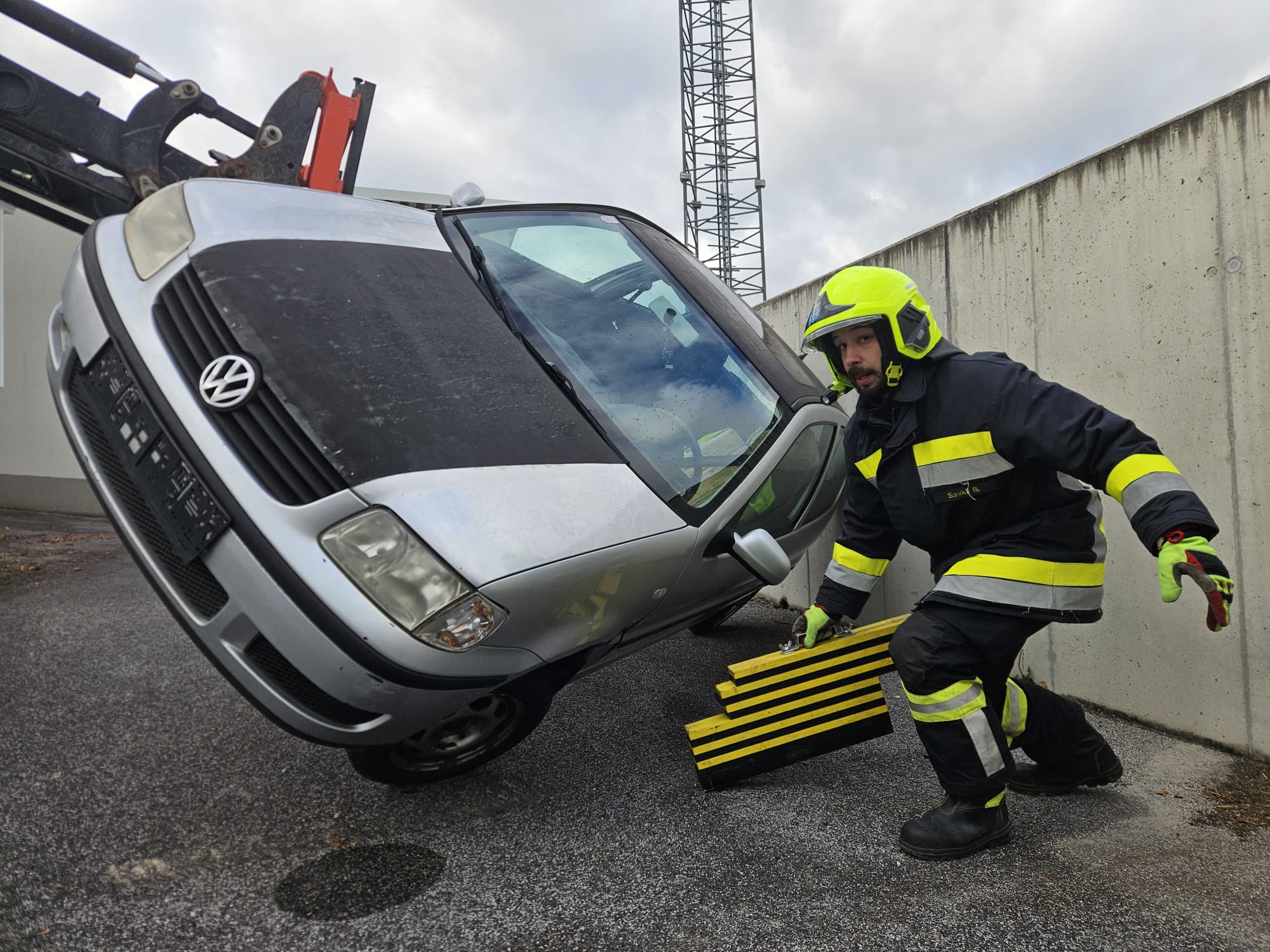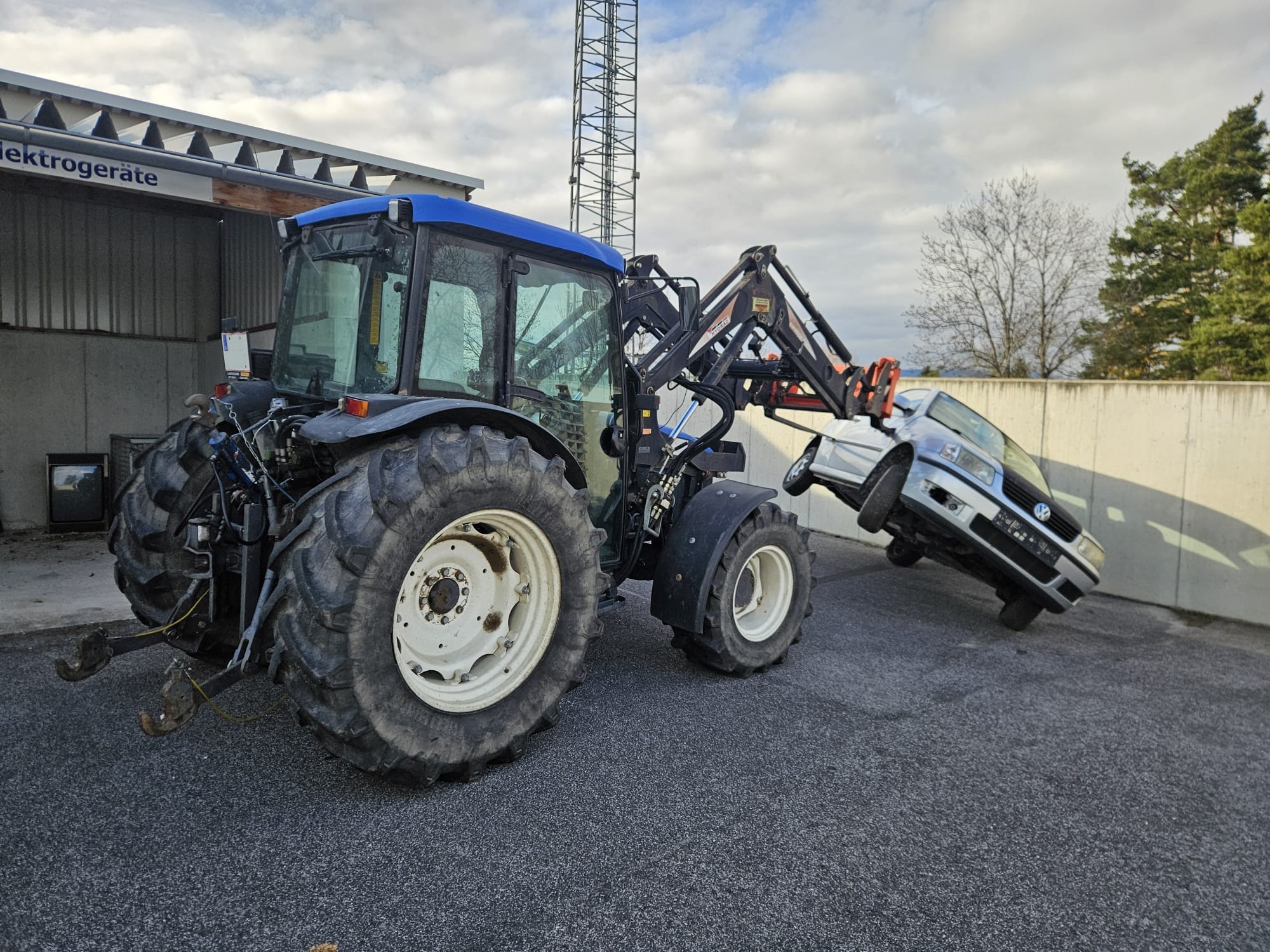 Nachdem die Übungspuppe erfolgreich aus dem Fahrzeug gerettet worden war, konnte das Auto vom Frontlader heruntergelassen werden. Anschließend diente es noch weiteren praktischen Tests, um den Umgang mit Spreizer und Schere unter realistischen Bedingungen zu vertiefen.