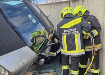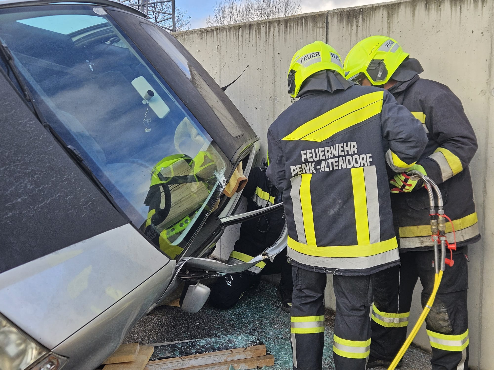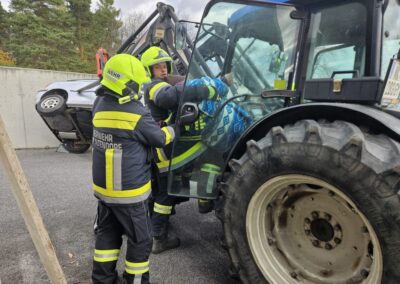 Während sich die Rettung des Traktorfahrers relativ einfach gestaltete, erforderte die Befreiung des Pkw-Lenkers deutlich mehr Aufwand. Mit Spreizer und Schere wurde ein Zugang geschaffen, um die Person sicher aus dem Fahrzeug befreien zu können.