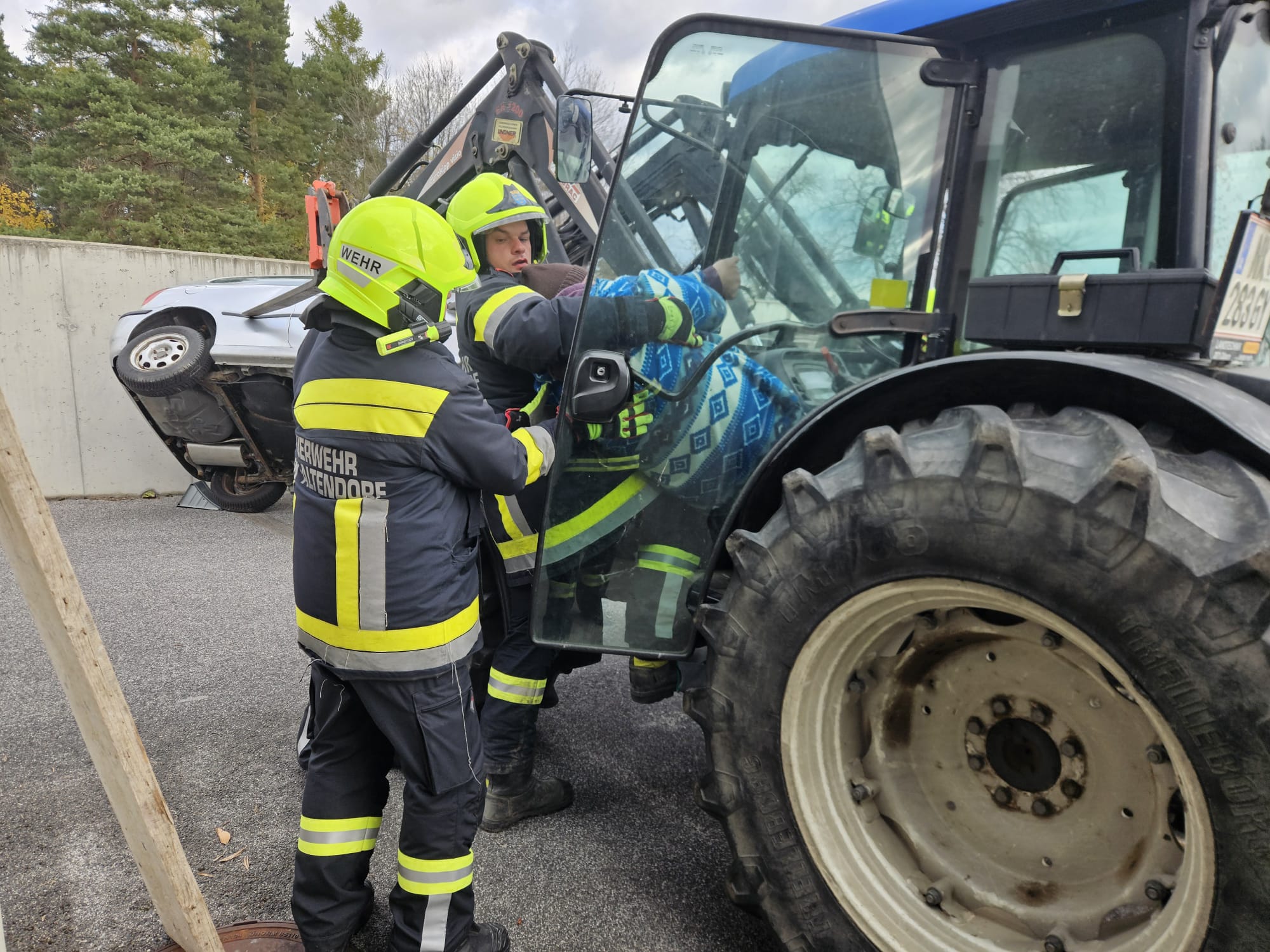 Ein Traktor hatte mit seinem Frontlader einen Pkw gerammt, wodurch das Auto schräg hängend zum Stillstand kam und der Frontlader des Traktors im Fahrzeug stecken blieb. Es galt, beide Lenker – den des Traktors und den des Pkw – zu retten.