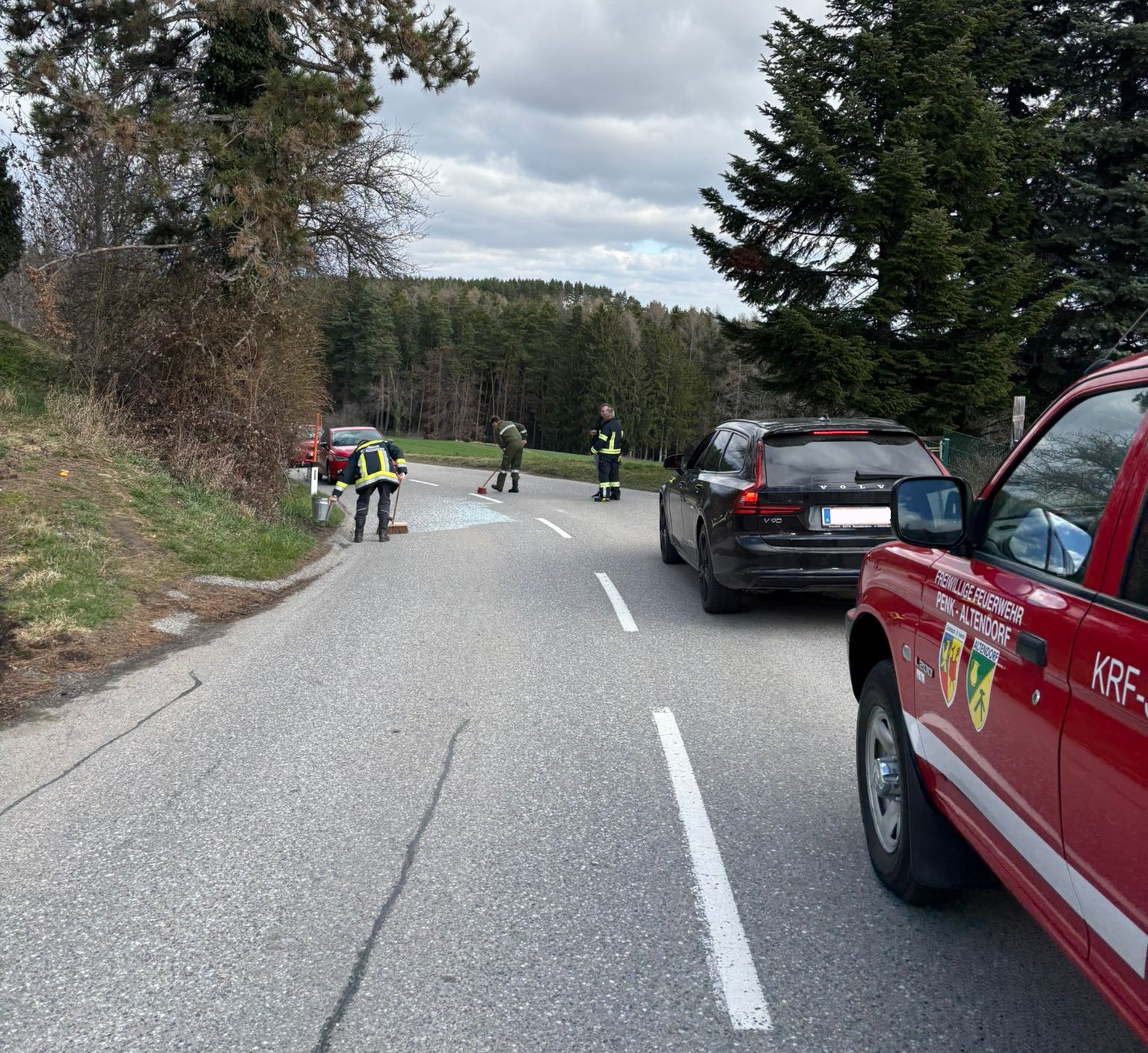 Beim Eintreffen am Einsatzort stellte sich heraus, dass sich Glassplitter auf der Fahrbahn befanden. Umgehend wurde die Gefahrenstelle abgesichert und mit der Entfernung der Glassplitter begonnen.