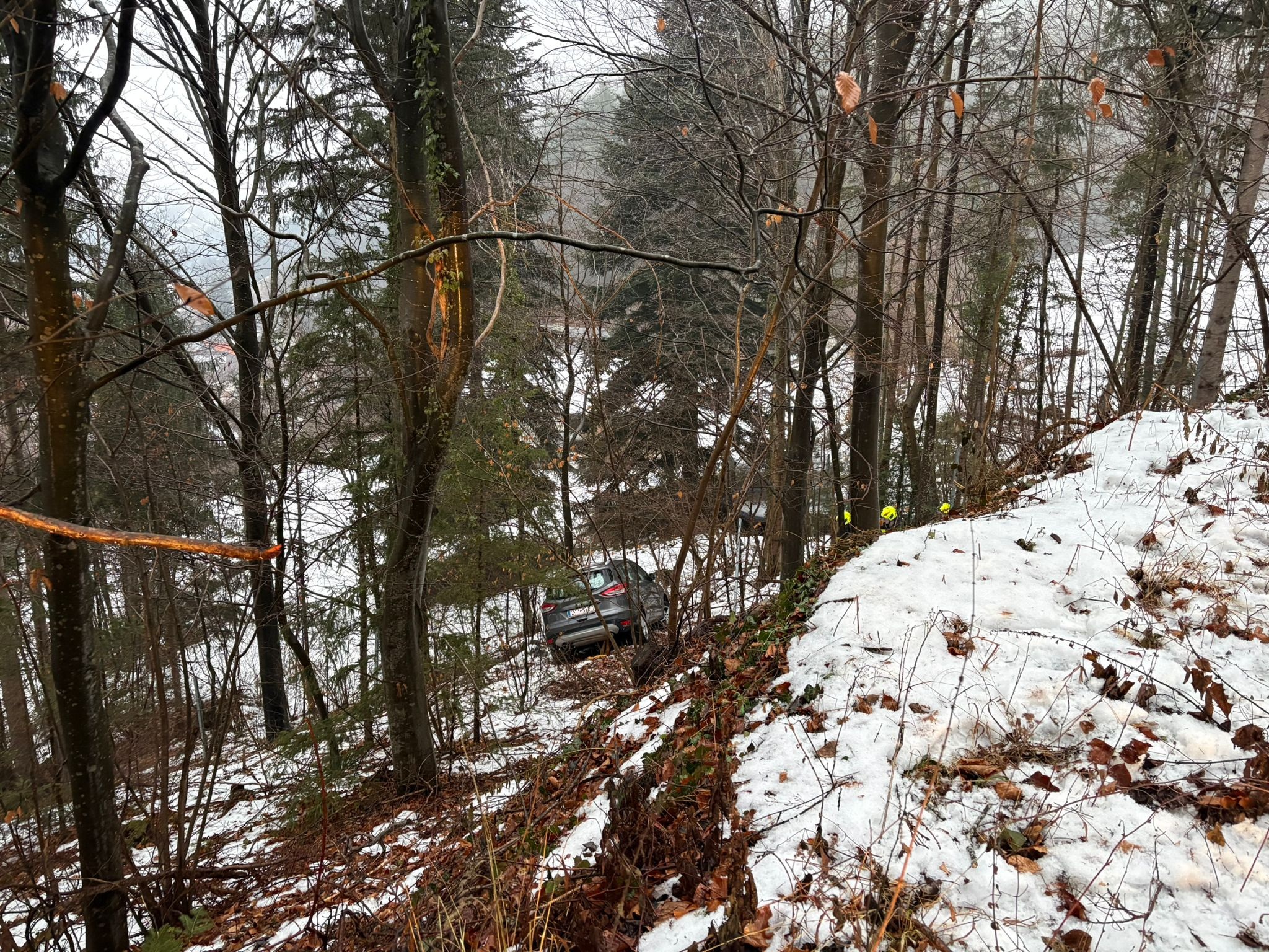Ein PKW war aus bislang unbekannter Ursache von der Fahrbahn abgekommen und seitlich der Straße an einem Hang zum Stillstand gekommen.